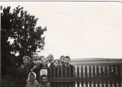 Dzieci z Radawnicy. Przed płotem siedzą Urszula i Stefan Herudaj. Od lewej stoją: Jan Durecki, Józef Radowski, Leon Herudaj, Edward Radowski, Marian Durecki, Henryk Durecki i Józef Brzeziński.